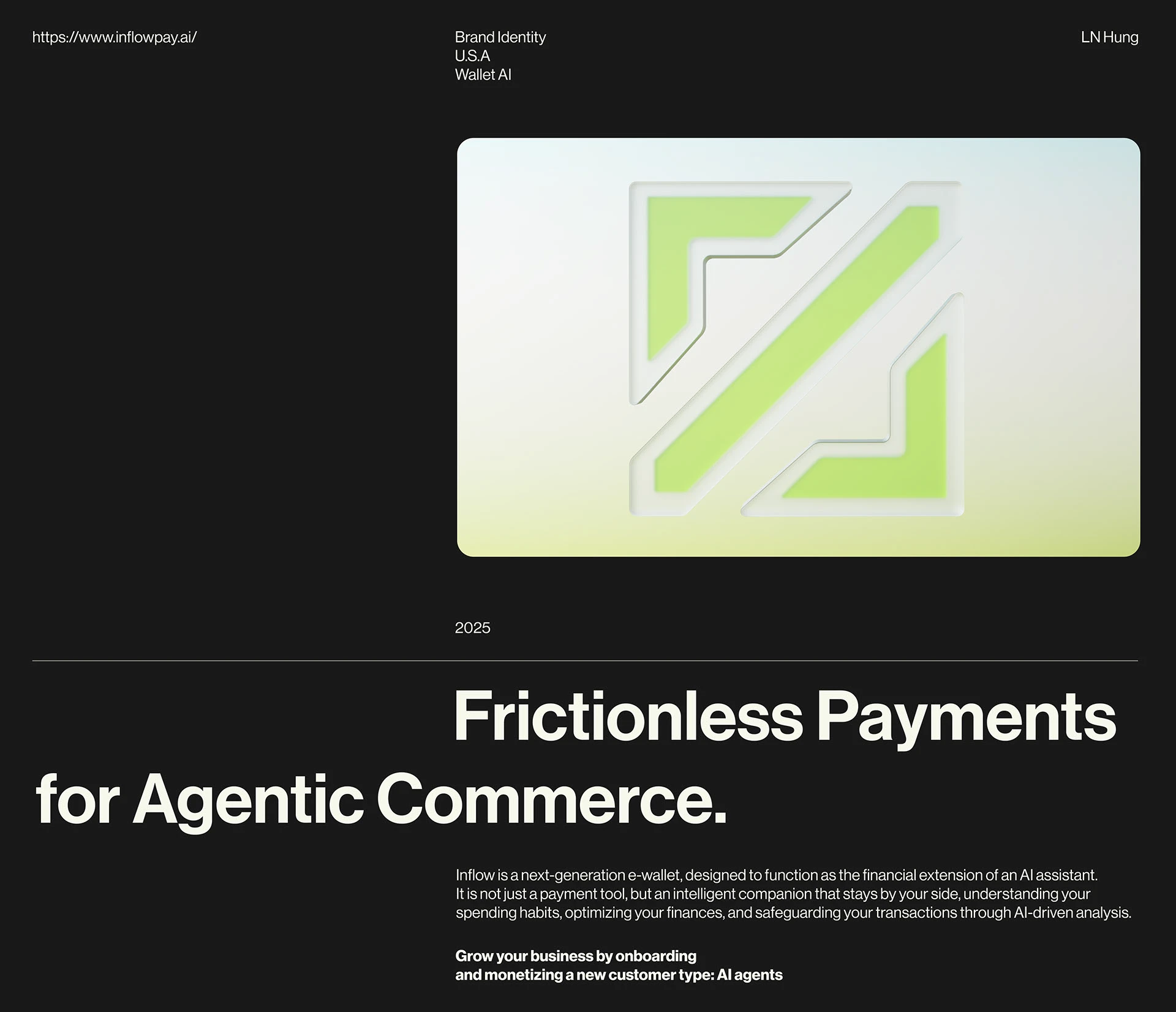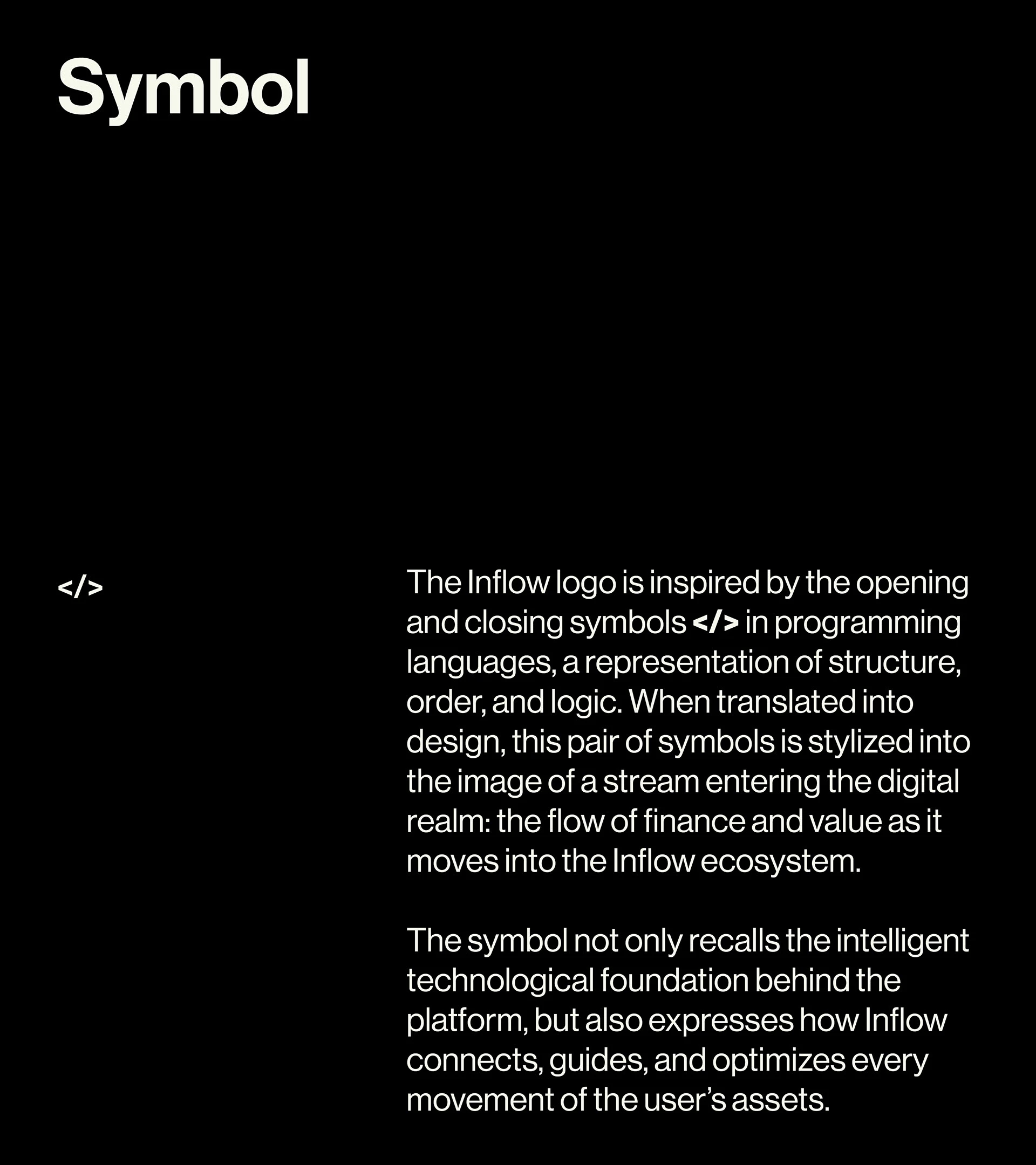 The Logomark is inspired by the opening and closing symbols </> in programming, an emblem of structure, order, and logic. Translated into design, this symbol is stylized into the image of a stream entering the digital realm, representing the flow of finance and value within the Inflow ecosystem.
